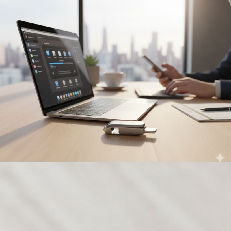 Connectors: Dual interface — USB-C (Type-C) and USB-A (Type-A) in one drive (swivel/rotating metal housing).