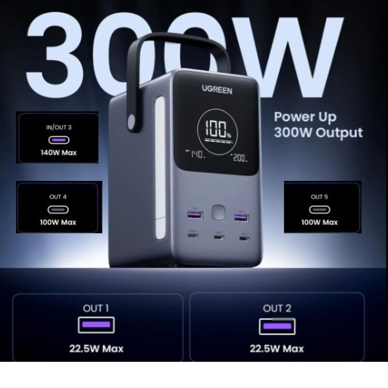 - 3 outputs: 3 * USB-C + 2 USB-A (charge 5 devices simultaneously)