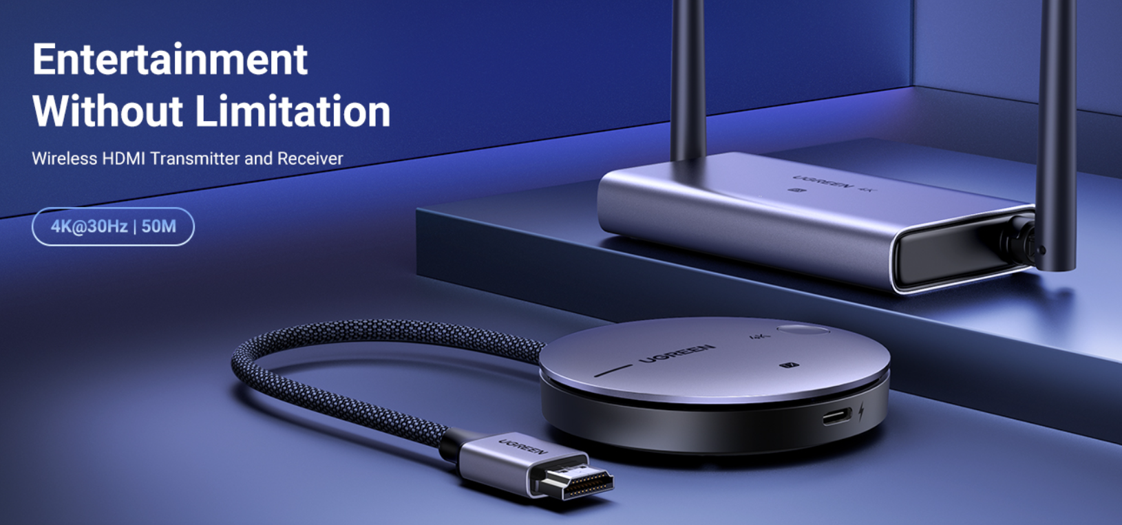 Wireless transmission up to 50 meters (≈ 164 ft) in direct line of sight (no obstruction) using 5GHz wireless band and dual-antenna design.