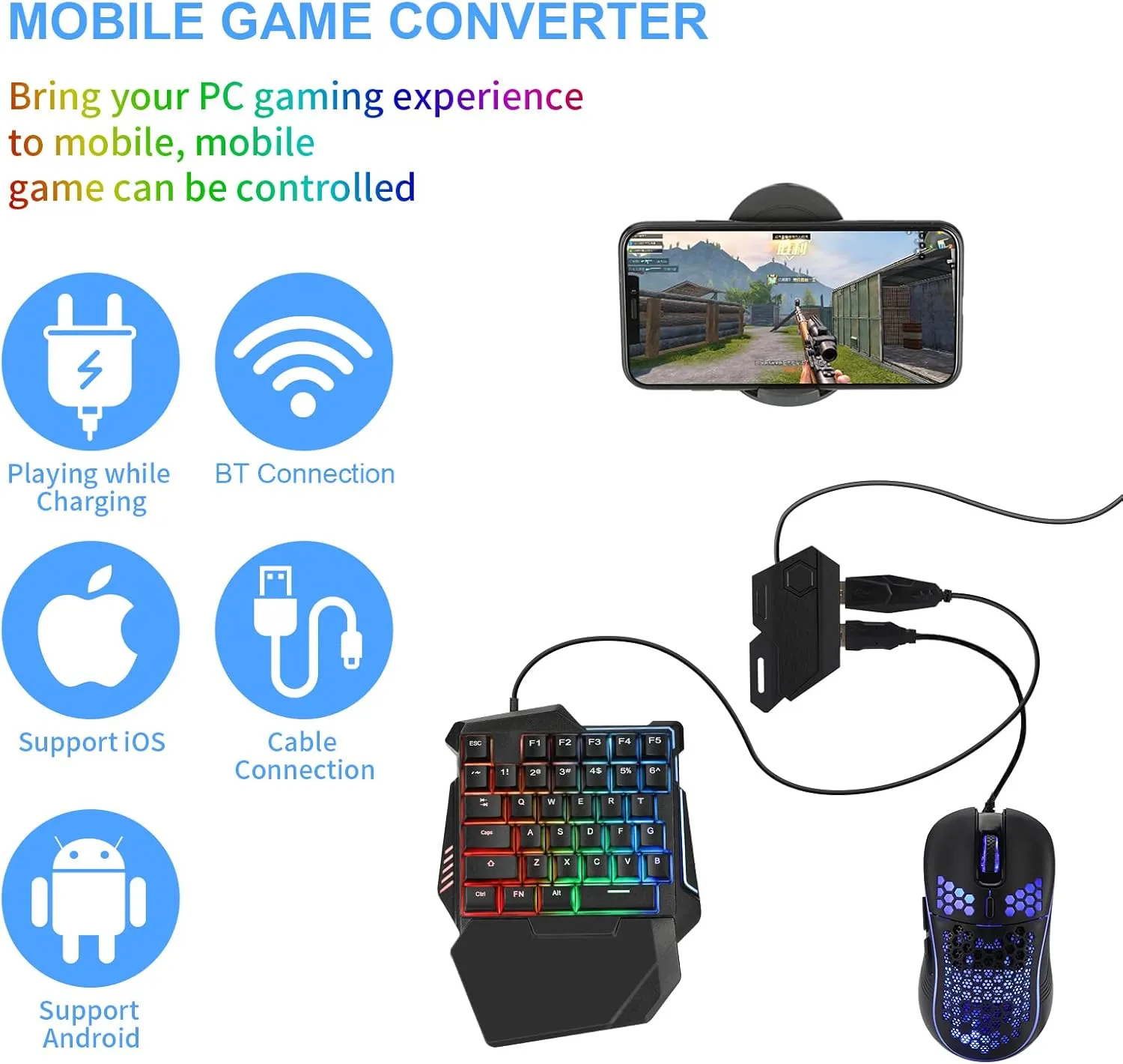 Applicable systems: for Android, Hongmeng, Xiaomi and compatible with Samsung (Since the systems compatible with Apple iOS 13.4 and later have disabled the touch screen mapping function compatible with Bluetooth and our game adapters need this function of map, so compatible with Apple systems are not supported.)