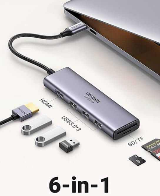 Ugreen CM511 20956A 6 in1 HUB: expand USB-C connector with HDMI ports, 3x USB-A 3.0, SD/TF card reader. Data transfer up to 5 Gb/s, 4K 30Hz resolution, aluminum housing, compatibility with Windows, Mac OS, Linux.